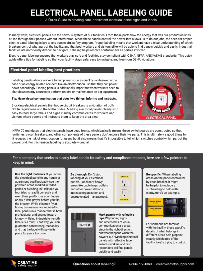 A related requirement is nec 210.5 (c) (3), which defines the labeling of conductors originating within each branch circuit panelboard or similar branch circuit distribution equipment. Most of the electrical health and safety regulations can be found in t8ccr, chapter But that's not the whole story. According to the osha standard 29 cfr 1910.303 (g), companies are required to provide 3 feet of clearance around electrical services and breaker panels with between 120 and 250 volts. Osha is citing and fining employers for failure to protect employees from the dangers of arc flash. Prevent injury from electrical hazards by clearly labeling all control panels and components. Suitability of equipment for an identified purpose may be evidenced by listing or labeling for that identified purpose. The basic procedure for circuit breaker box labeling. These regulations are contained in title 8 of the california code of regulations (t8ccr). Breaker panels should be easily accessible and should never be blocked. Electrical safe work practices including electrical safety principles, guidelines for qualification of personnel, job planning requirements and management and personal responsibility will be covered. Note to paragraph (b)(1)(i) of this section: Alert employees to important electrical safety information.
